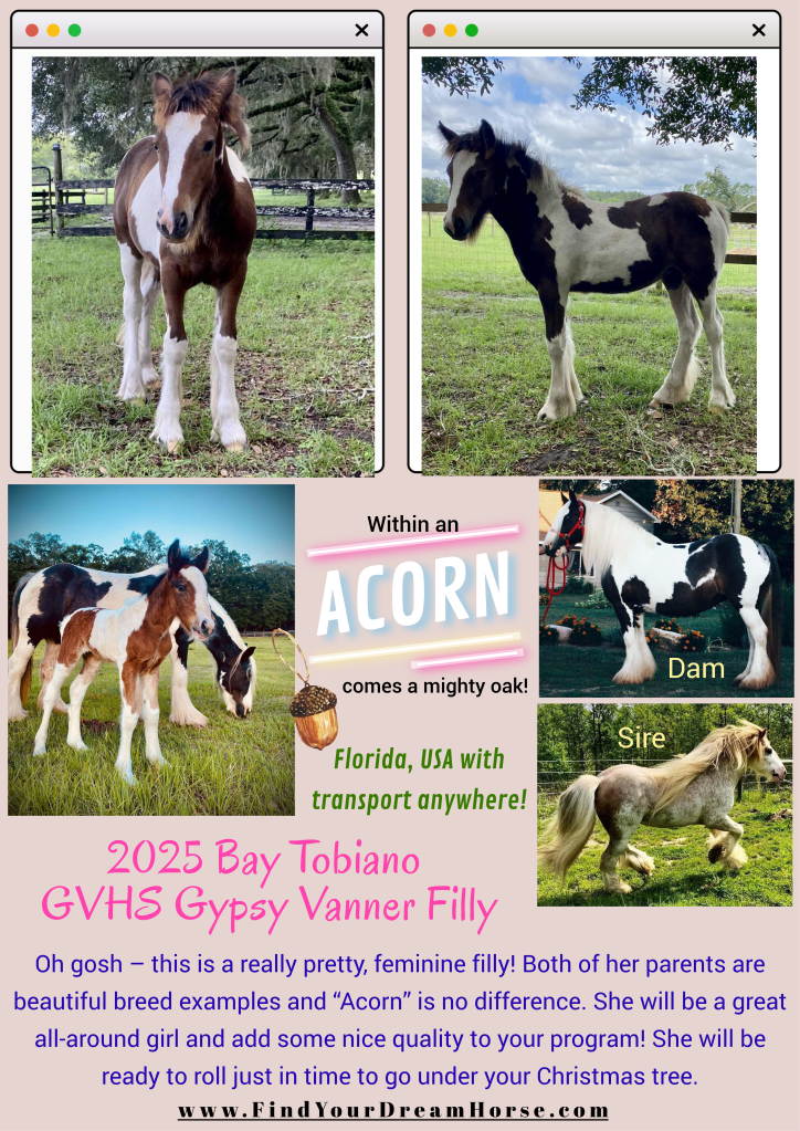 Oh gosh – this is a really pretty, feminine filly! Both of her parents are beautiful breed examples and “Acorn” is no difference. She will be a great all-around girl and add some nice quality to your program! She will be ready to roll just in time to go under your Christmas tree.