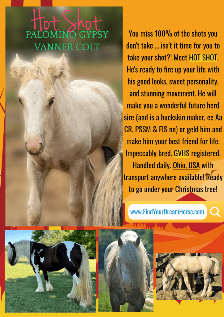 This boy is a spitting image of his stellar sire, Warrior! He will make his mark, whether he is used as a future herd sire or whether he is gelded, trained, and shown. Hot Shot is a sweet, proper colt that is handled daily and will be ready to head your way just in time for Christmas.