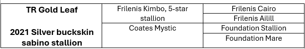 Sire: Frilenis Kimbo, 5-star rated imported stallion